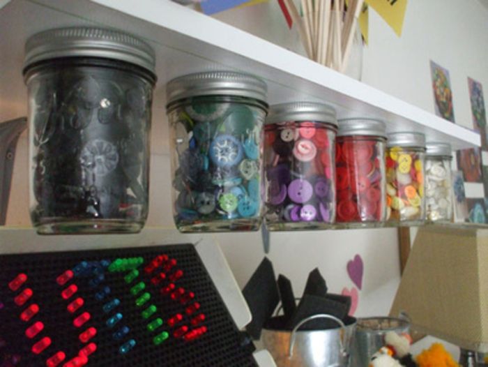 Пуговицы куда удобнее хранить в небольших банках, чем в коробках или шкатулках.